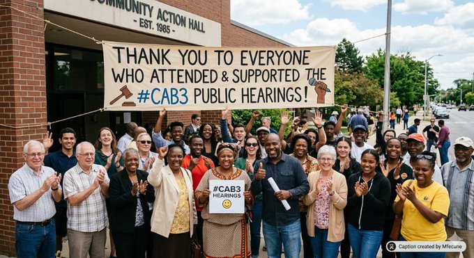 EXHIBIT A — THE FABRICATION "It is encouraging to witness democratic processes in action, with due consideration given to public input. #CAB3" — @nickmangwana, 1 April 2026 • Building reads "Community Action Hall — Est. 1985" — an American building, US Midwest • Bottom-right watermark: "Caption created by Mfecune" — AI generation credit, in plain sight • #CAB3 Hearings placard is digitally inserted into the crowd • Uniformly joyful, improbably diverse crowd — statistically impossible at any actual venue • Posted on April Fools' Day. Accidentally precise. |